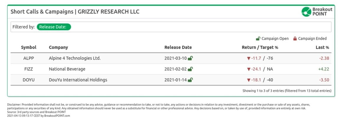 This year, Grizzly has published short reports on Alpine 4 Holdings Inc (OTCMKTS:ALPP), National Beverage Corp. (NASDAQ:FIZZ) and DouYu International Holdings Ltd (NASDAQ:DOYU). The firm has had an excellent year so far and is one of the top short-sellers in terms of performance of the shorts it has reported on.