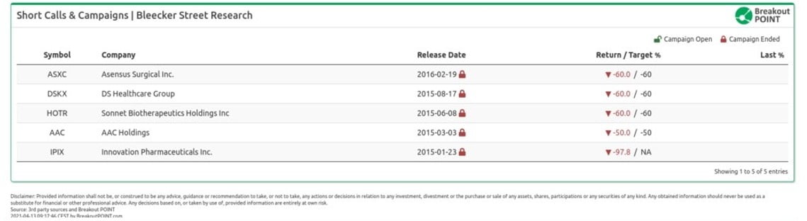 Breakout Point says Bleecker Street Research is making a comeback, as it hasn’t been active in a while. The firm has an impeccable track record, although its most recent short reports were in 2015 and 2016.
