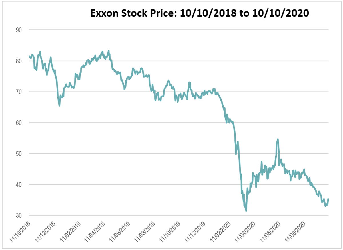 Most stock valuation chatter on the internet focuses on companies with great growth opportunities like Zoom, Wayfair and Peloton or well known companies whose stocks have outperformed like Apple and Amazon. Here we take a look at the other side of the coin and present a valuation of Exxon Mobil Corporation (NYSE:XOM). Needless to say, the past few years have not been happy ones for Exxon. Plunging oil prices, caused by a combination of Covid, a growing worldwide recognition of the need to transition to sustainable energy, and a variety of other headwinds have caused Exxon’s stock price (charted below) to drop from a high of $83.38 to a recent low below $33.00.