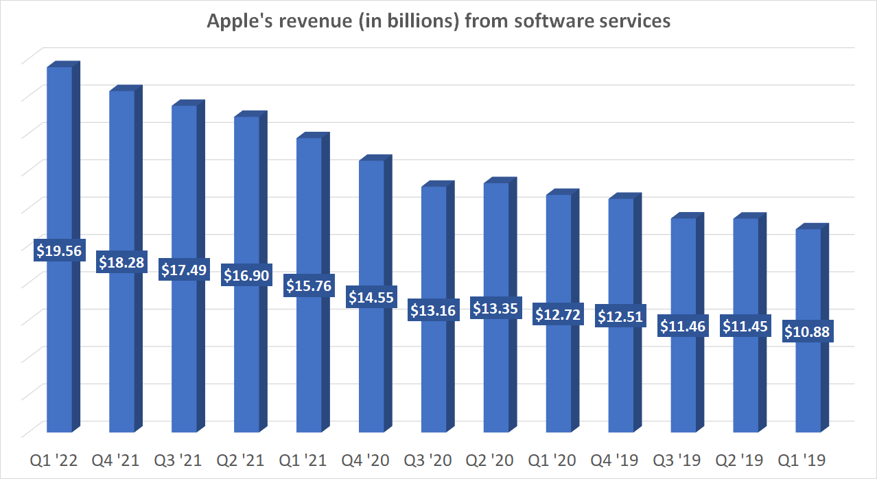 As the Q2 2022 report showed, Apple's profit climbed by 6%, at $25 billion. However, this is a major slowdown from previous five consecutive quarters that held double-digit range growth. In contrast, Apple's SaaS revenue has been on a rampage, nearly doubling from 2019.