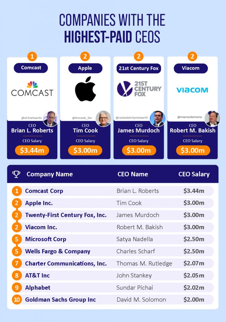 The study firstly looked at the highest-paid CEOs, which revealed that Comcast’s CEO, Brian L. Roberts is the highest-paid, earning a base salary of $3.44m. Comcast is based in Philadelphia and owns several hugely successful media companies such as Sky Group, NBC Universal, and DreamWorks Animation. Brian L. Roberts is estimated to be worth $1.8bn overall, so his Comcast salary only makes up a fraction of his earnings. Apple’s CEO Tim Cook was in second place, with a base salary of $3m. Similarly, Viacom’s CEO, Robert M. Bakish earned $3m per year. However, whilst Tim Cook is said to be worth $1.4bn, Robert M. Bakish’s net worth dwarfs it in comparison, at $25.5m.