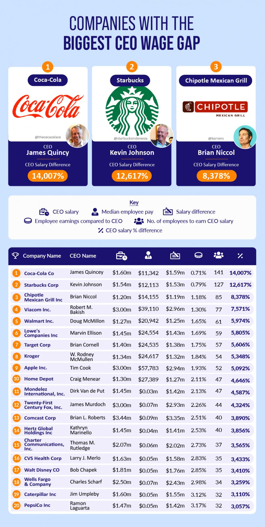 Next, the study looked at the biggest wage gaps between CEOs and their employees, calculated as a percentage difference. In first place, with a stark gap of 14,007%, was Coca-Cola’s CEO, James Quincey. Quincey’s annual salary is $1.6m, whilst the average employee for the company earns just $11,342 - a wage gap of over $1.5m. Quincey first joined the business in 1996 and was named CEO in 2016. In second place was another huge corporation - Starbucks - and its CEO Kevin Johnson. Johnson’s annual salary stands at $1.54m, while the median employee wage is $12,113 - creating a wage gap of 12,617%. Johnson has been in his role at Starbucks for five years, since 2017. In third place was fast-food giant Chipotle, and their CEO Brian Niccol, who earns a salary of $1.2m, whilst employees are paid a median salary of $14,155, creating a gap of 8,378%. Interestingly, earlier in 2021, Chipotle was sued in New York for violating the city’s Fair Workweek Law, accusing the company of abusing workers at five locations in Brooklyn. The lawsuit was the first of its kind to be brought under a publicly-held corporate fast-food chain. At the time, Chipotle said it was dedicated to creating a ‘safe and engaging workplace’. The lawsuit is still going through court, and New York continues to investigate further complaints against the company.