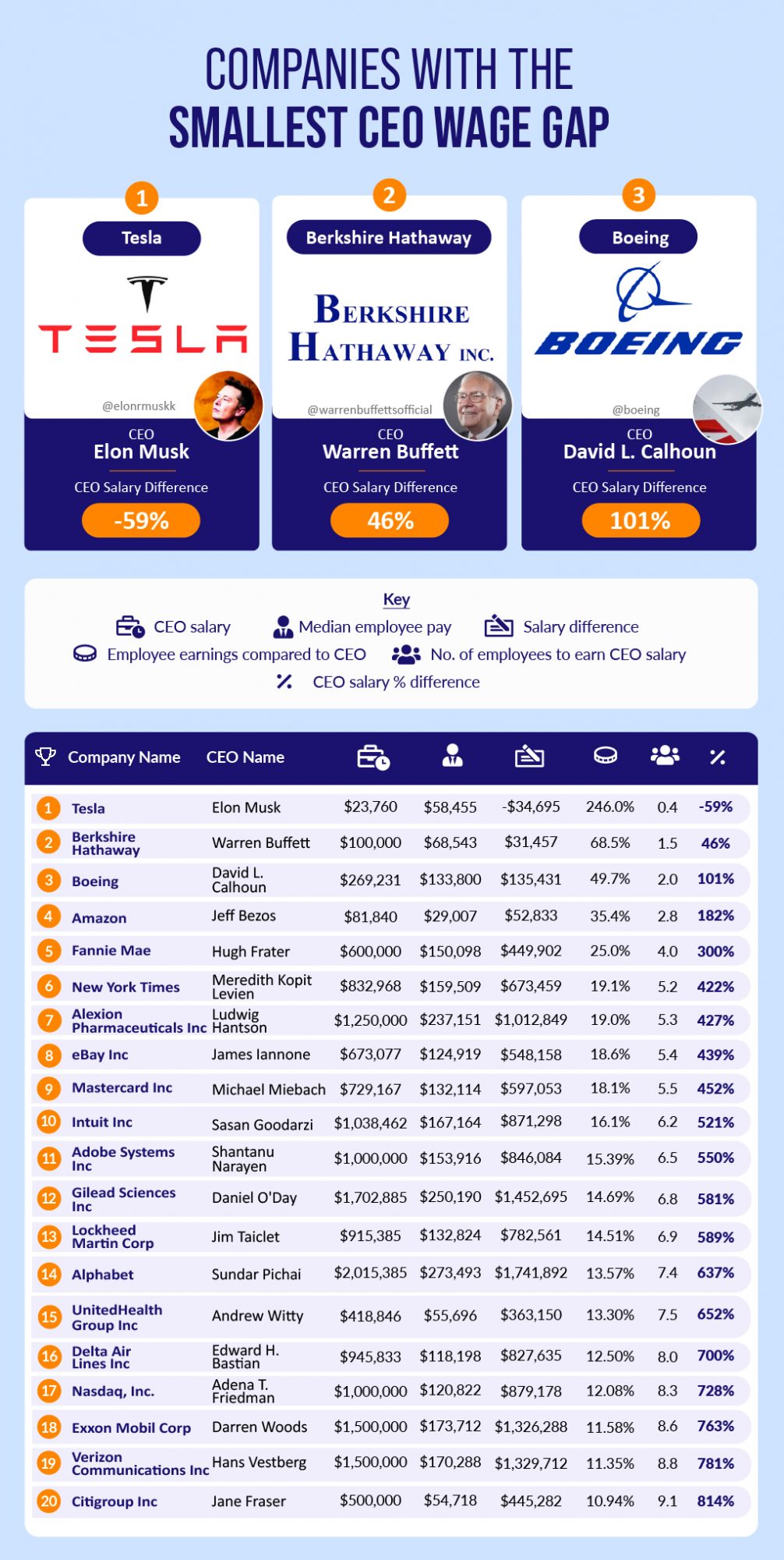Just after Tesla in the ranking was the CEO of Berkshire Hathaway, Warren Buffett, who earned just 46% more than his employees - with a salary of $100,000, compared to the median employee pay of $68,543. In third place was the CEO of Boeing, David L. Calhoun, with a wage gap of 101%. Calhoun earns $269,23, whilst employees at the company earn $133,800. Other companies in the top 10 include the New York Times, eBay, and Mastercard.