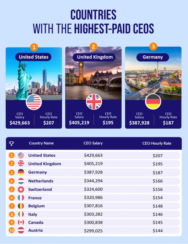 Overall, the study found that the USA has the highest-paid CEOs in the world, with an average salary of $429,663, or an hourly rate of $207. The UK was in second place, with an average salary of $405,219, followed by Germany, with an average pay of $387,928.