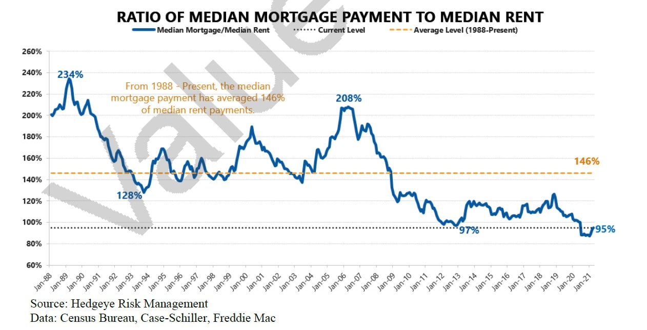 The following graph illustrates that despite the recent increase in home prices, home ownership in the U.S. remains historically attractive relative to the cost of renting: