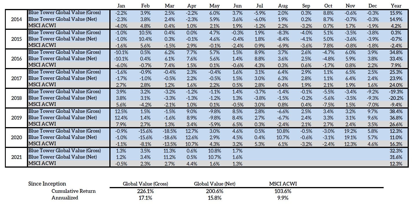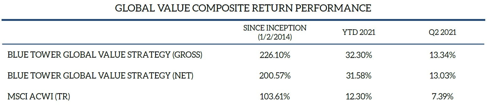 Blue Tower Asset Management commentary for the second quarter ended June 30, 2021.