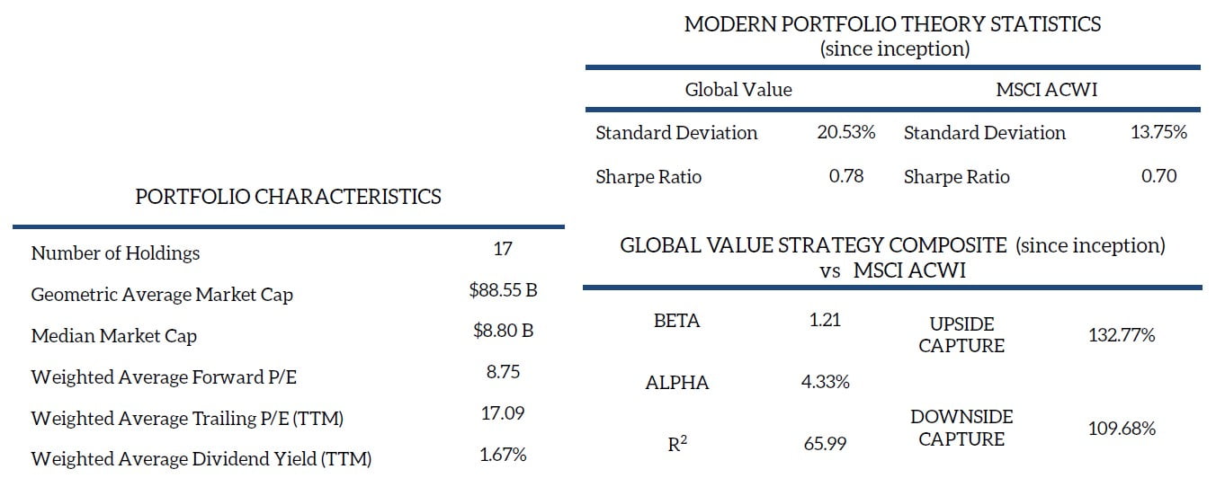 We have seen continued strength in our Global Value strategy composite which delivered a gain of 13.03% net of fees (13.34% gross) for Q2, adding to our significant gain in Q1. While we adjusted position sizes through trading, we did not any add or remove any companies to our portfolio this quarter.