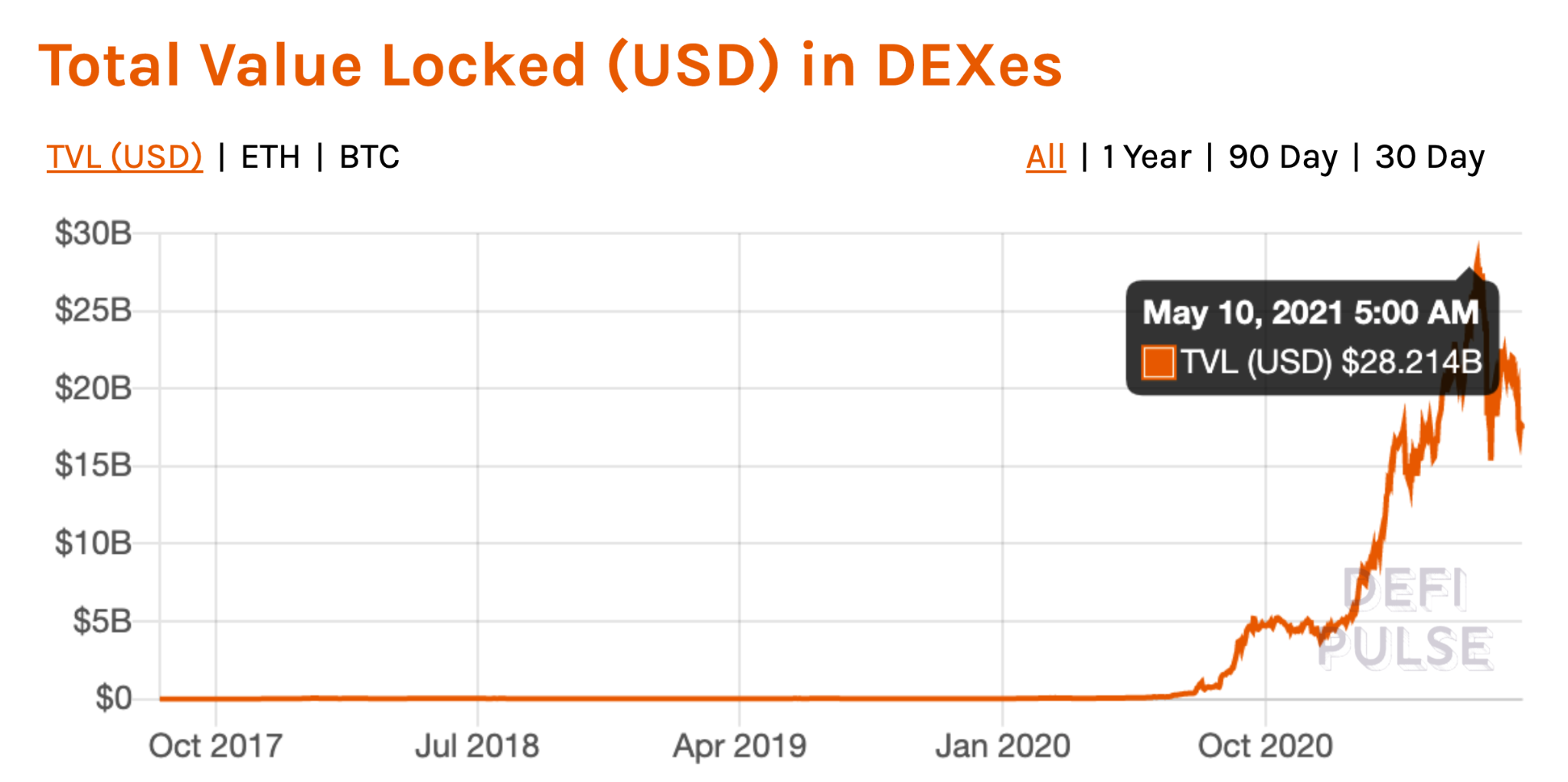 2020 marked the triumphant rise of Defi amid the chaotic turn of events. The market flourished with decentralized exchanges (DEX) and protocols, and the community gew at an exponential rate. Defi DEX platforms catalyzed the mass adoption of blockchain solutions, and the total value locked (TVL) in various DEX platforms reached $28.21B at its peak.