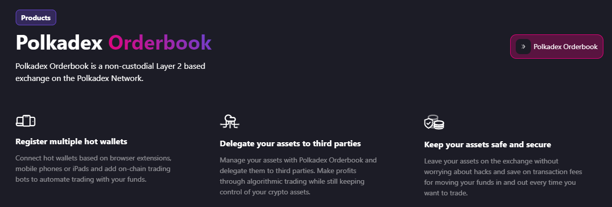 PolkaDex is an order book DEX platform established on the idea of combining the features of both decentralized exchanges and centralized exchanges. It is a decentralized platform with an order book approach for trading tokens in a P2P trustless environment. The order book approach allows PolkaDex to facilitate users with high liquidity, fast transaction speeds, and a very secure trading environment.