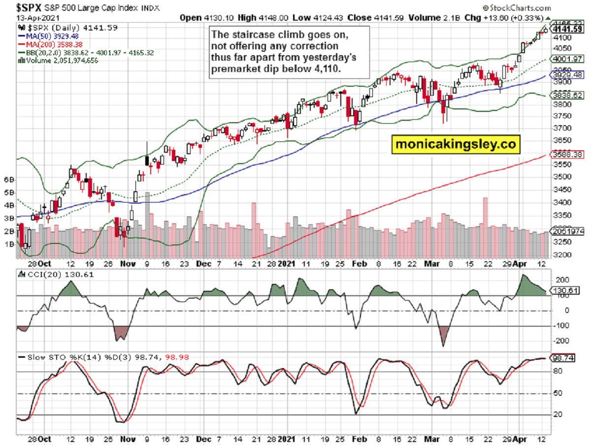 S&P 500 went up yet again yesterday, and the corporate credit markets‘ non-confirmation quite resolved itself. While the same can‘t be said about smallcaps or emerging markets in the least, S&P 500 doesn‘t care, and keeps up the staircase rally without real corrections to speak of.