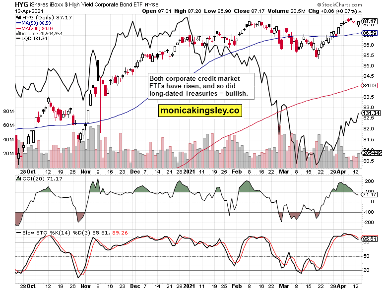 Both high yield corporate bonds (HYG ETF) and the investment grade ones (LQD ETF) turned around yesterday, and so did long-dated Treasuries – and that supports the bullish spirits in stocks. It was indeed right to view the prior non-confirmation as not too pressing at the moment.