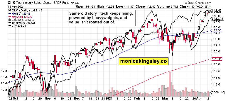 Not even intraday ones, unless you count the sharp and brief premarket one yesterday before the CPI figures came out. That‘s the result of the sea of liquidity in practice, and the avalanche of stimuli. The 1.50% yield scare on 10-year Treasuries is long forgotten, and technology welcomes every stabilization, every retreat from even quite higher levels, and value stocks barely budge. No real rotation to speak of and see here, move along.
